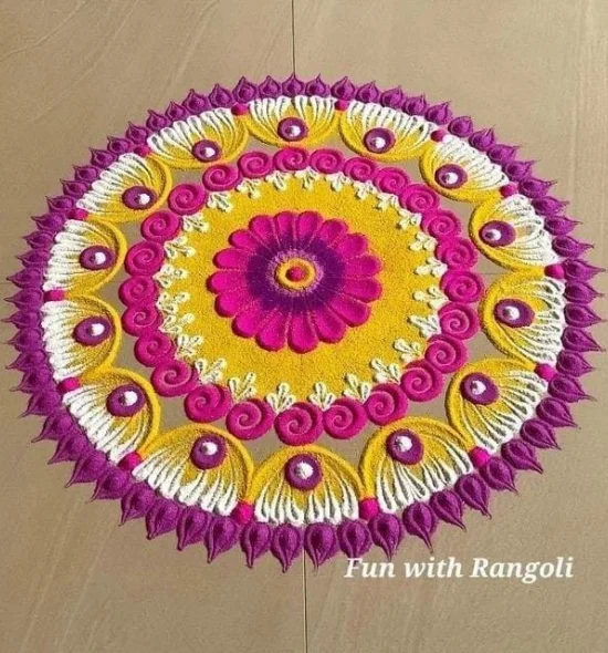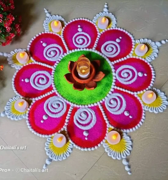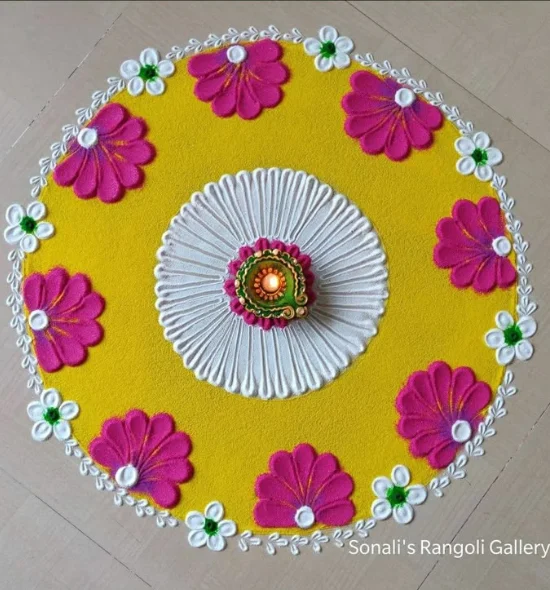This Geometric Rangoli Design is an excellent combination of symmetry and play of festive colors, hence a unique rangoli design of Diwali 2025. The white center with pink flower patterns and bright yellow base is a feeling of balance, happiness, and elegance- and the right thing to be able to bring prosperity and positivity to the homes. Its simplicity and simplicity in design and style make it among the most preferred easy rangoli patterns used in Diwali among amateurs and rangoli art admirers in India, Canada, and Australia. This gorgeous rangoli in Diwali not only beautifies your festive setup, but it is also the one that is a representation of harmony; therefore, it remains a classic in the unique rangoli designs and Diwali special rangoli lines.