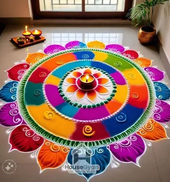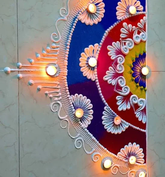 This Rangoli Designs With Diyas is the bright color, beautiful petal decoration, and the shining central diya that are sure to impart festive warmth to the rangoli design and make it the best rangoli design at Diwali 2025. The balance of the semicircles and hanging bead-shaped dots is simple to recreate. Hence, it is one of the simple rangoli designs that anyone can do with Diwali, and one of the small rangoli designs that anyone can do with Diwali, yet have big results with small steps. This Diwali rangoli is a beautiful blend of elegance and symbols, and should be the favorite of the families of India and the Indian communities in Canada and Australia, whether they want a beautiful rangoli to decorate their Diwali or a Diwali special rangoli.