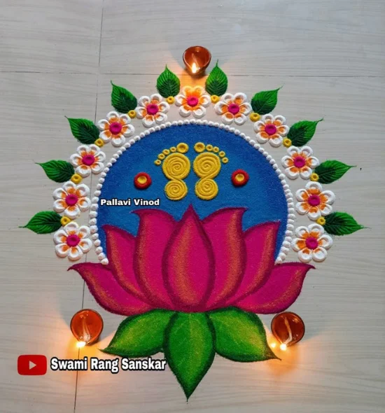 This grand Lotus Rangoli Design is the pinnacle of a conventional rangoli design for Diwali, and it is thus an excellent selection to be used in Diwali 2025, anywhere around the world, be it an Indian courtyard or a large Canadian or Australian home. With the holy pink lotus, the footprint of goddess Lakshmi, and a garland of flowers and diyas, the latter is a potent laxmi rangoli that is expected to bring good luck and prosperity. Its vivid and detailed coloration makes it a very beautiful rangoli to use during Diwali, as it picks up the spirituality of the festival. This design is so popular since it is not just a decoration but a ritual greeting the Goddess, and it is the main aim of a rangoli design to invite the Goddess to Diwali as well as a beautiful scenery to capture the moments of your festive bliss.
