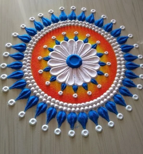 The picture-perfect Round Rangoli Design would be the perfect option to use during your celebrations, and it would easily become one of the nominees in the list of the best rangoli designs to use during Diwali in 2025. This is a masterpiece work of art, which combines tradition and modern art in a perfect manner, using auspicious colors such as orange and yellow, which symbolize prosperity, which is contrasted dramatically with the royal blue petals and pure white accents. This advanced palette and organized radiating pattern make it more than just a decoration, and it becomes an authentic Diwali special rangoli. And whether you want to make a warm welcome entrance in India, a festive foyer entrance in Canada, or a vibrant patio display entrance in Australia, the design provides a refreshing and unique rangoli design alternative that is not only intricate to look at but also easy to implement. The reason why I chose to concentrate on this type of rangoli design on Diwali is that it sees your place of worship glowing with a profound spiritual allure, putting on a spectacular grand show as the aura of the festival of lights, and making it a memorable experience for all your guests.