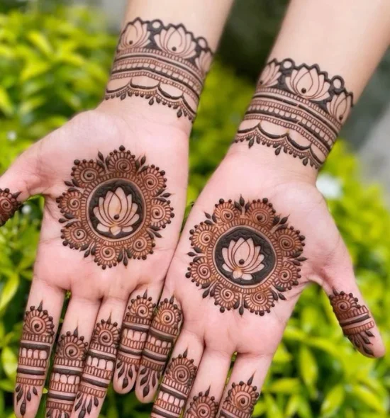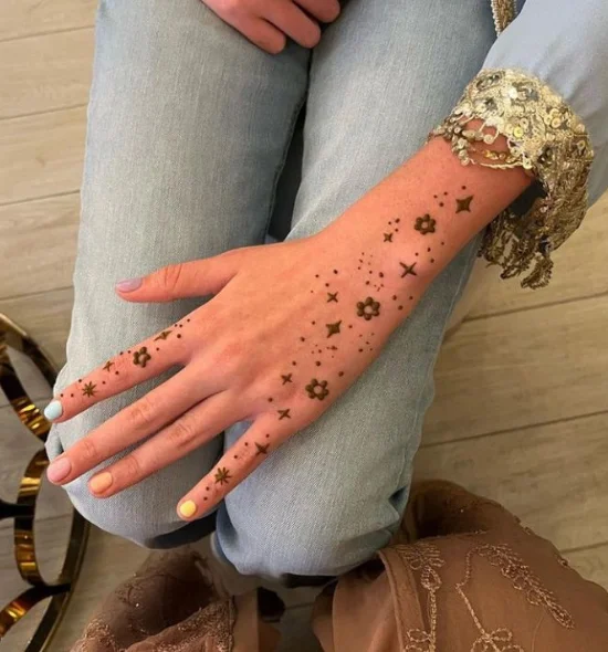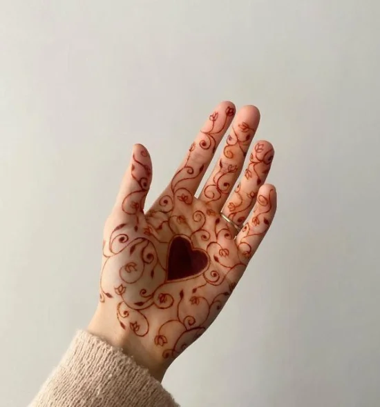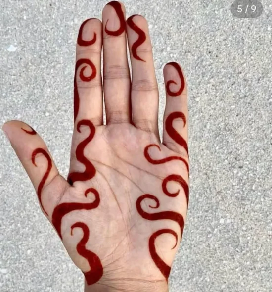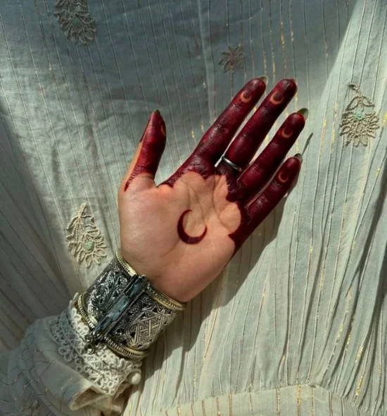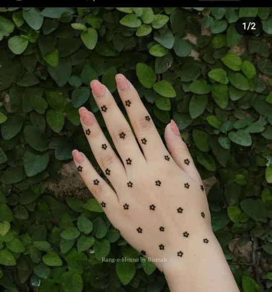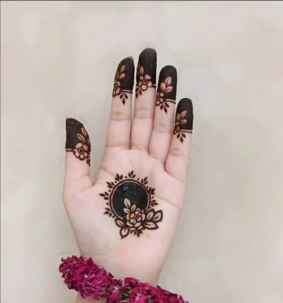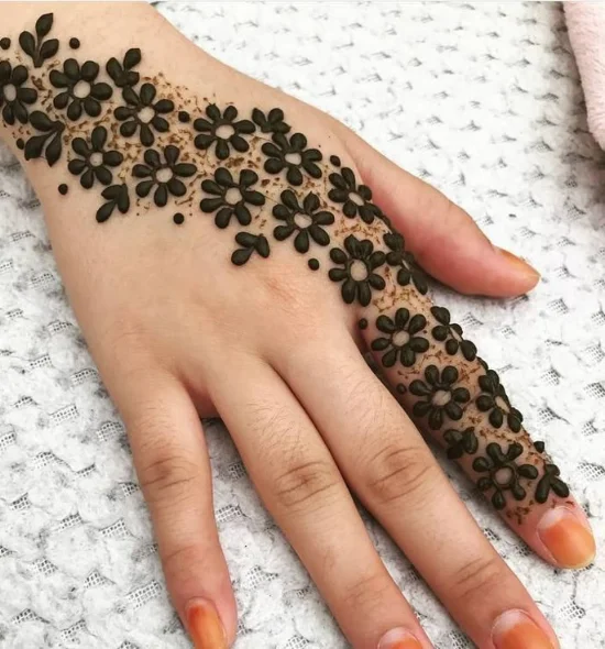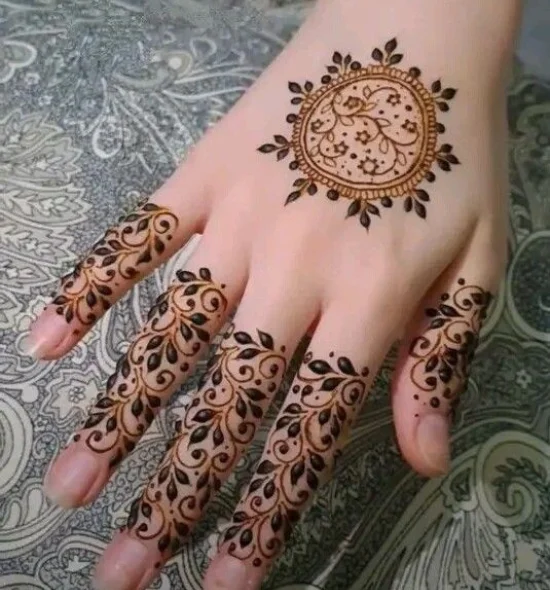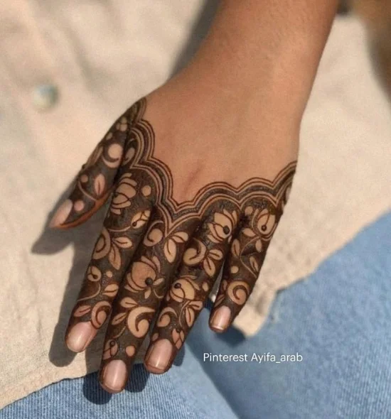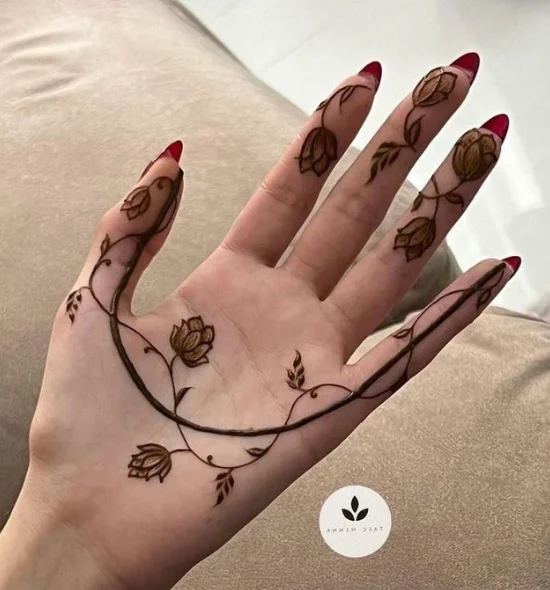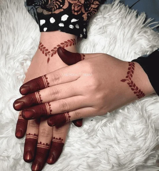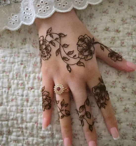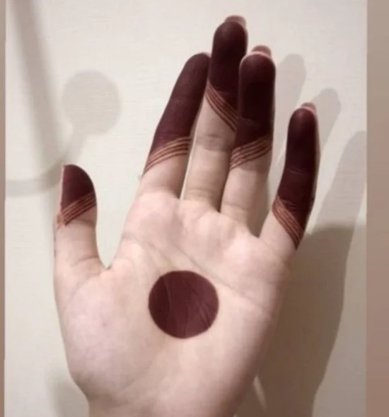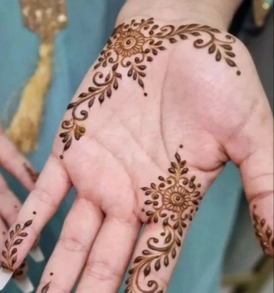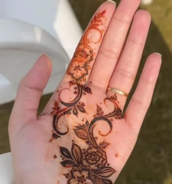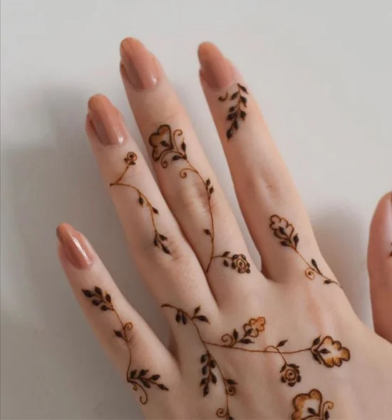 Little leaves with strokes that resemble delicate vines travel down the fingers in the Minimal Leaf Trail, a gorgeous and fashionable finger mehndi design. It looks light and airy, making it suitable for a laid-back date, celebrations, or even bridesmaids who appreciate subtle style. This straightforward mehndi design leaves the fingers feeling elegant and light, and it goes well with jewelry and nails. It is regarded as one of the most well-liked straightforward finger mehndi designs that blends contemporary style with traditional elements.