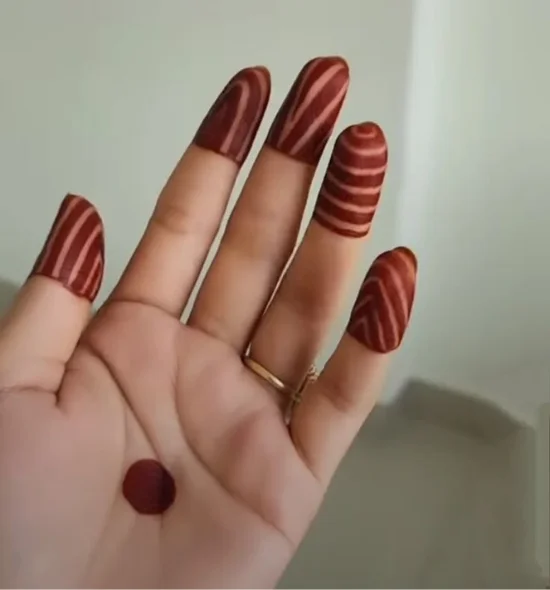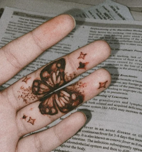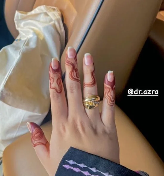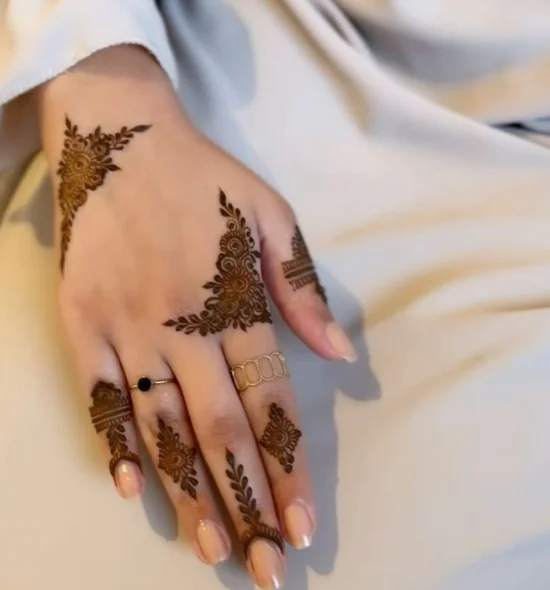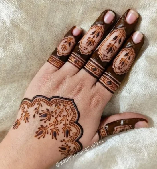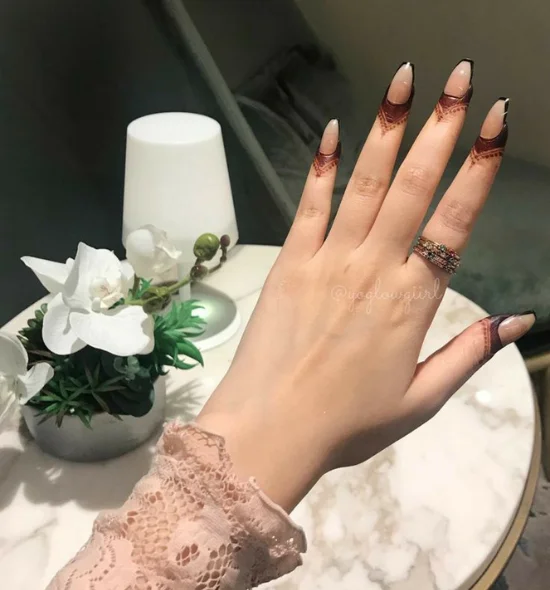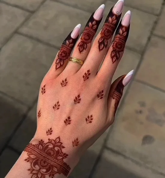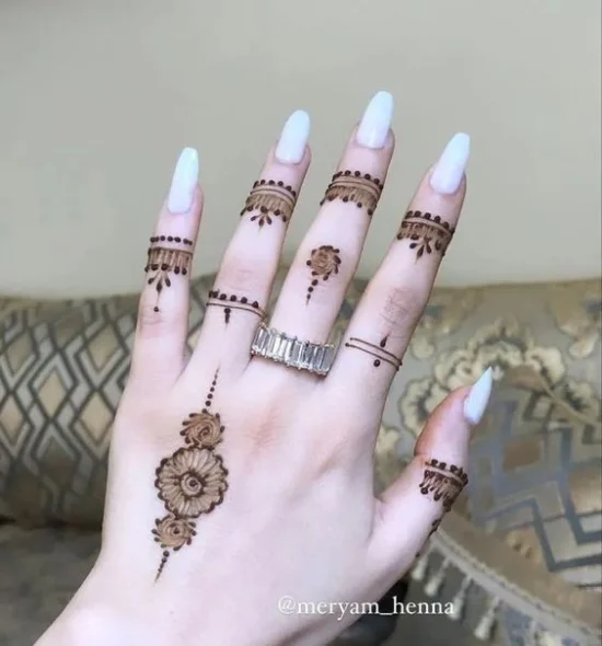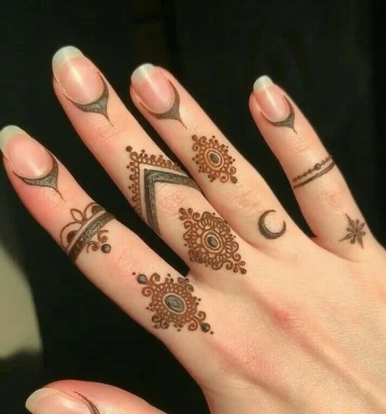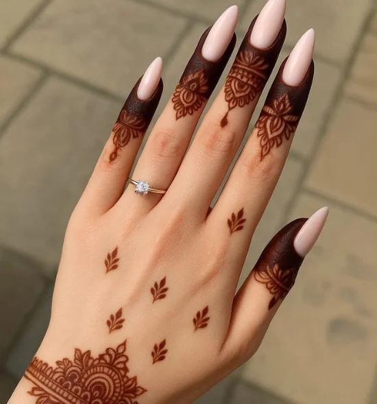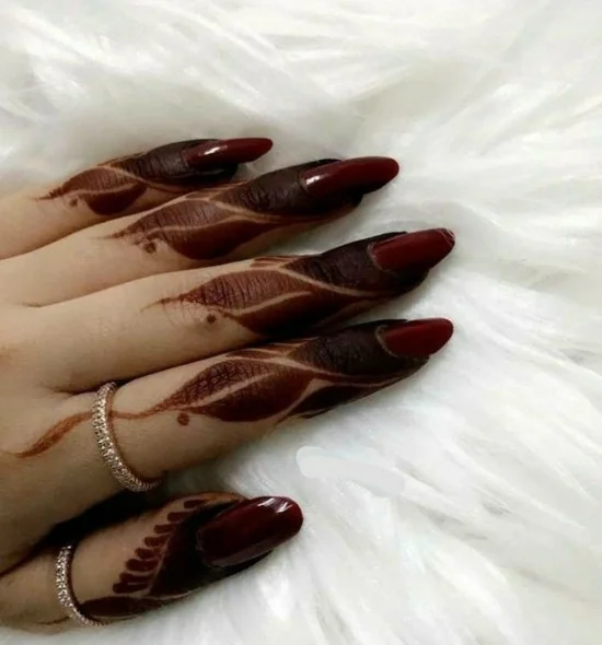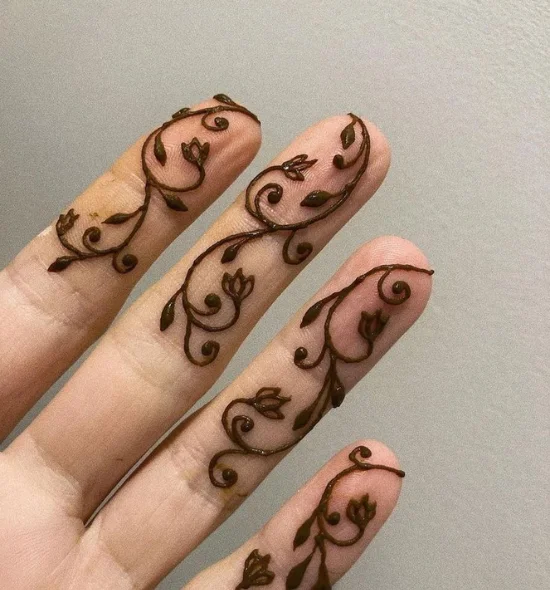 Mehndi on the fingers. Finger mehndi has always been a continuation of the ancient customs of using henna in ceremonies and as a fashion statement. As a straightforward and useful substitute for henna on the entire hand, people began applying henna to the tips and bands of their fingers. It became a well-known style over time, and in the last few decades, social media and fashion trends have helped to revive and popularize little, photogenic designs at fingertips. It is now prized for its speed and beauty, as well as its traditional symbolism and exhibition of nail art and rings.