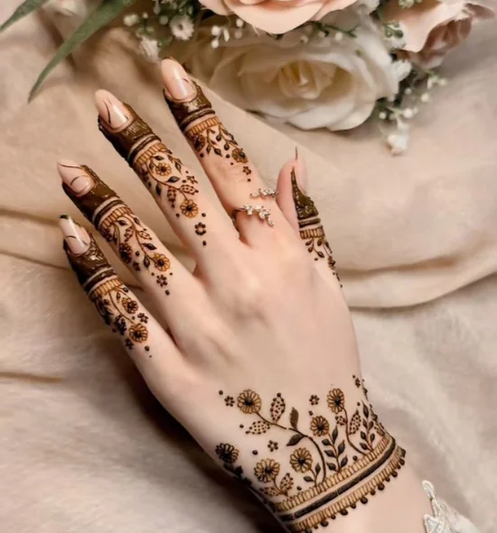 In addition to being a trendy addition, stylish finger mehndi designs are a quick, glitzy way to express yourself and add luster to any ensemble. These little patterns would be ideal for festivals, weddings, parties, or even just everyday occasions when you want to add a little something special without spending a lot of time on it. Trending minimalist flower tips, line patterns, rings, and bridal monograms offer it a versatile and modern appearance, while the strong contrast and quick application provide stability. Minimalists require minimalist mehndi, and those involved in bridal finger mehndi glitz will adore this trendy design that combines traditional and contemporary elements to highlight your hands and add sleeve, nail, and ring accents. It also looks stunning on social media.