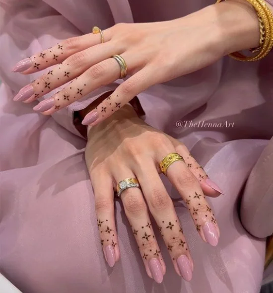 Finger mehndi is a type of henna application where the full palm or back of the hand is not covered; instead, just the tips, sides, nail beds, or tiny bands surrounding the joints are. Styles range from small dots and delicate gilded vines to large tips, geometric lines, rings with negative space, and little motifs that fit easily on one finger or two.
