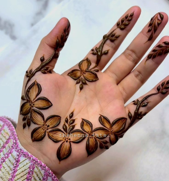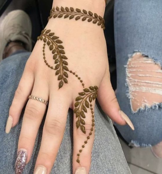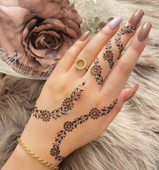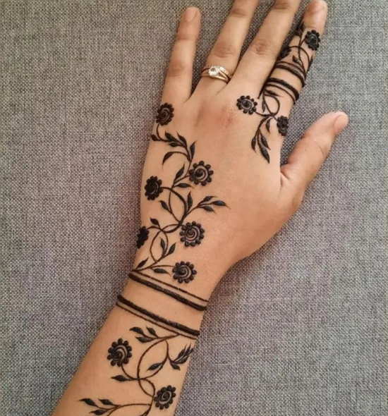 Pretty daisy blossoms and leafy vines flowing across the hand characterize the Daisy Vine Band, a simple mehndi design for ladies. If you enjoy a minimalist mehndi design and want to explore the latest mehndi design trend, it’s ideal for Eid Mehndi Designs 2025. All ages can benefit from this fashionable pattern, from adults to children’s mehndi designs. Regardless of your preference for full-hand or basic mehndi patterns for Eid, this stylish style works well for both.