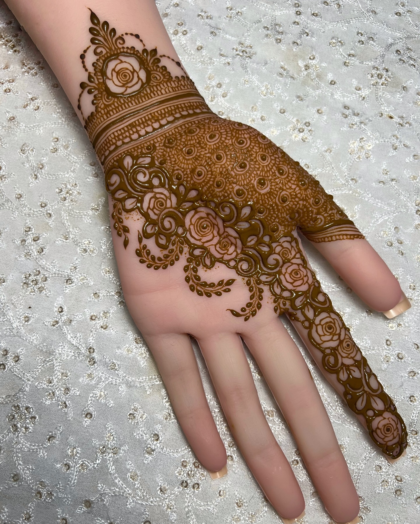 This elegant rose and paisley bridal mehndi design features bold floral patterns, intricate paisleys, and symmetrical detailing that covers the palms and arms beautifully. A perfect choice for brides, this mehndi design also inspires ideas for mehndi designs, backhand mehndi designs, and even simple mehndi design variations.