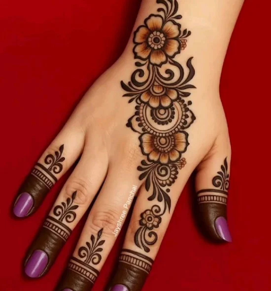 Basic Mehndi Design For beginner – this is the finger forward design, combined with a bold outline, simple petals, and dotted bead work, where even the beginner can replicate with ease.