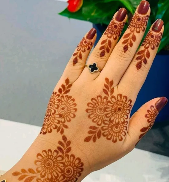 Amateurs are fond of it as you can just follow a basic beginner method of back hand mehndi design, which involves putting the rosettes in, connecting them using stems, and then filling in with dots to create balance.